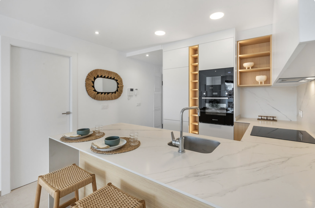 De elegante porseleinen tegelvloeren zorgen voor een luxe uitstraling en zijn bovendien onderhoudsvriendelijk. De volledig uitgeruste keukens met inbouwapparatuur bieden extra gemak in het dagelijks leven. Dankzij de praktische ingebouwde kasten wordt de beschikbare ruimte optimaal benut.