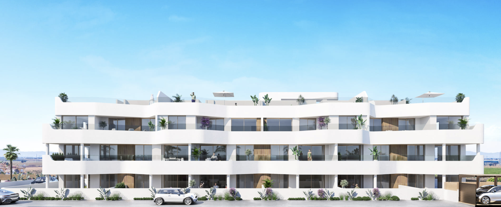 Appartementen op de begane grond bieden een privétuin, ideaal voor ontspanning en recreatie, terwijl de penthousesbeschikken over een solarium voor volledig privégebruik van de zon. Deze buitenruimtes voegen extra waarde toe en creëren mogelijkheden voor buitenentertainment.